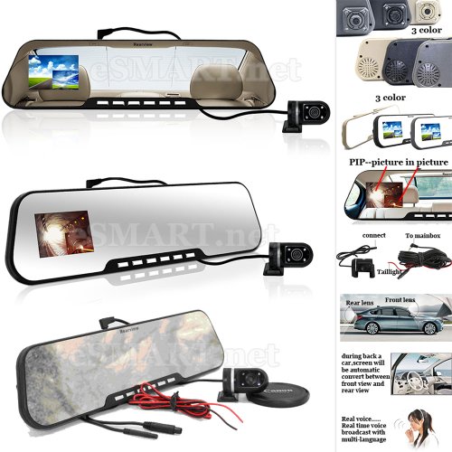 - G-sensor------Collision sensors,a hardware sensors was implanted in the traffic recorder, also it was upgrade to the newest operating system program. The purpose is ::::: when the vehicle by the traffic impact, traffic recorder automatically open video record of what happened; more important, it can be locked this paragraph video. The video is segmented saved, advantages is:::: most convenient to look at the video on the computer, you can always delete unwanted video segment. Not be covered by loop recording, this video is locked state can not be deleted. For an example :::::: The vehicle met an accident, the driver lost consciousness, the traffic recorder if not at work, there may be the period important video is overwritten, losing valuable evidence.Emergency locking is a new upgrade feature in rearview traffic recorder, During the recording process, you can press the MODE key to manually lock the video clips, the aims paragraph video will not be overwritten...Dual cameras( Front camera:1920*1080 S/15 frame + back/rear camera: 640*480 S/30 frame ),recording at same time...(PIP)picture in picture: support front and back/rear lens,full screen and PIP...Real time voice broadcast with multi-language....Real time visual control during back a car(via back/rear lens).